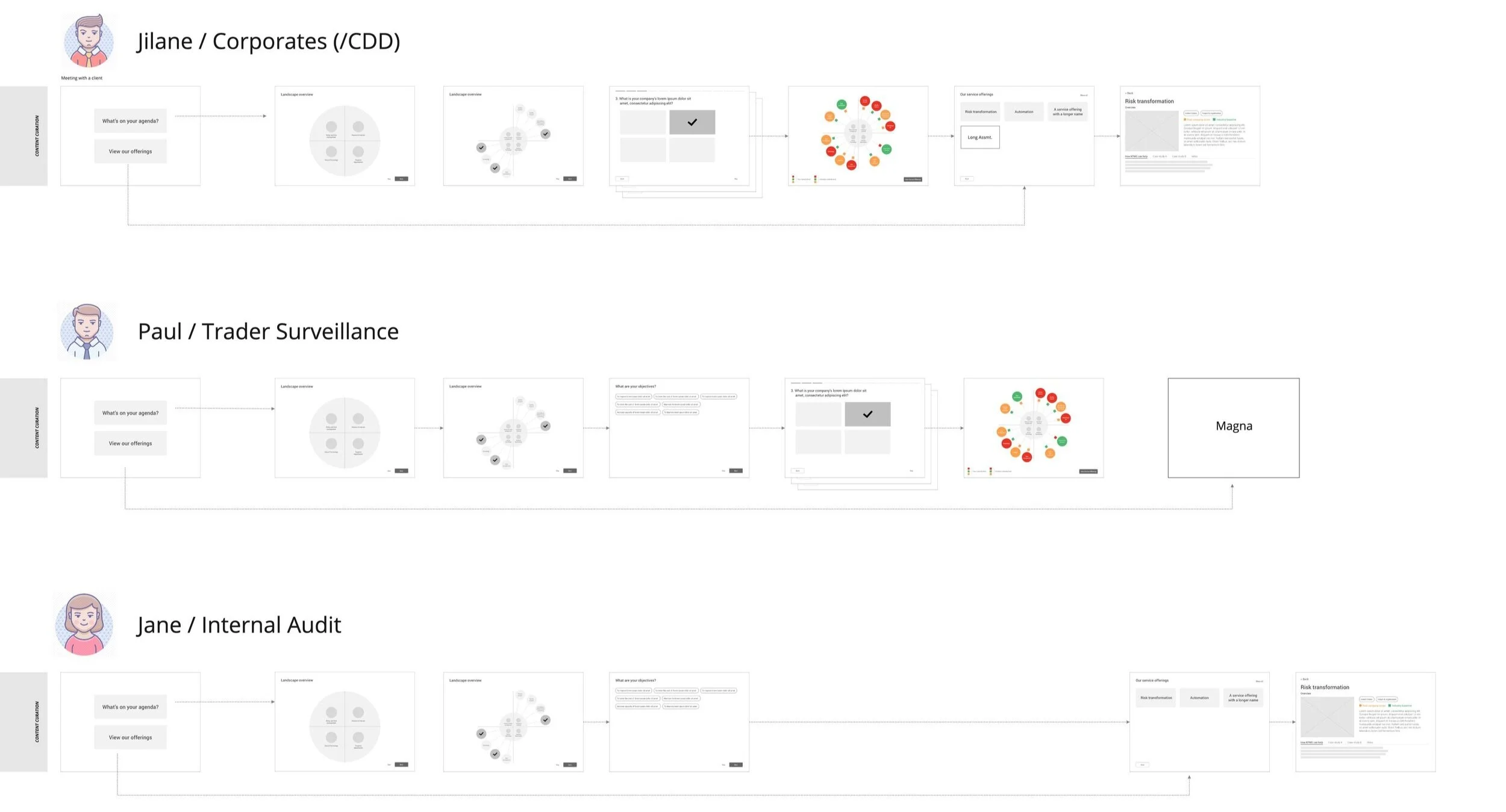 The main flow was that the tool would have visualisation of the industry landscape to help get the conversation started, then seamlessly lead to a short questionnaire that can provide the client with a maturity level. Afterwards, based on the questionnaire result, the tool would curate service offerings and case studies for review.